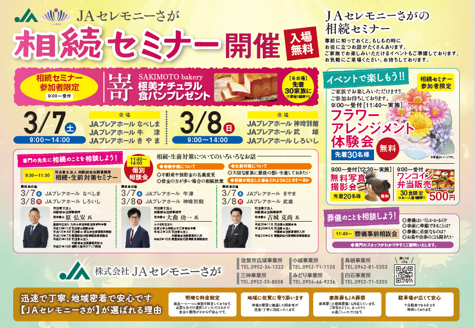 JAセレモニーさが 相続セミナー開催のお知らせ【3月7日・8日】